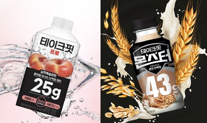 올해 선보인 초고단백 음료 ‘테이크핏 몬스터’ 2종(초코바나나맛·고소한맛)은 한 병에 단백질 43g을 함유해 스키·보드, 실내 고강도 운동 후 단백질을 간편하게 보충할 수 있다. 단백질 24g의 ‘테이크핏 맥스’ 4종(고소한맛·호박고구마맛·바나나맛·초코맛)은 운동 전후 또는 간단한 식사 대용으로 선택할 수 있는 기본형이다. 파우치 형태로 편의성을 높인 ‘테이크핏 아쿠아’ 2종(자몽맛·샤인머스캣맛)은 단백질 10g을 함유해 외출·이동 중 간편하게 단백질을 보충할 수 있다.