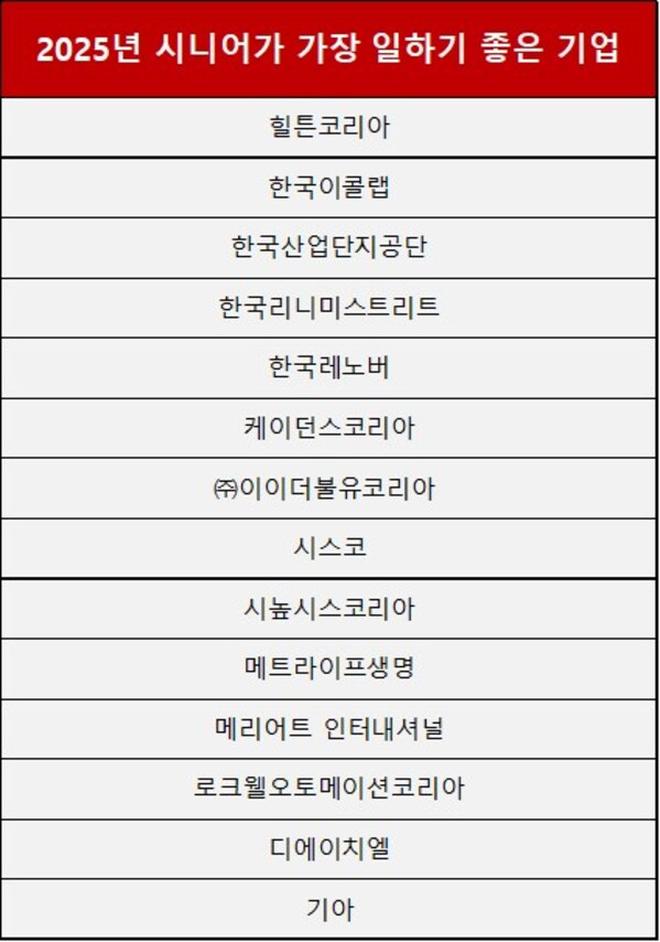 2025년 선정된 기업들은 시니어 직원들을 배려한 정책과 프로그램으로 조직 내 신뢰와 존중 문화를 형성했다는 점에서 높은 평가를 받았다. '2025년 대한민국 시니어가 가장 일하기 좋은 기업은 다음과 같다.