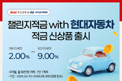 BNK부산은행(은행장 김성주)은 10일 현대자동차와 협력해 최고 연 9% 금리를 제공하는 ‘챌린지 적금 with 현대자동차’를 5000좌 한도로 출시했다. 이 상품은 자산 형성을 지원하는 포용금융과 친환경 소비를 유도하는 ESG 금융을 결합했다. 소외계층과 청년층에 우대금리를 제공하며, 전기차 구매 고객에게 추가 혜택을 적용해 금융과 친환경 가치를 반영했다. ‘챌린지 적금’은 월 50만원까지 납입 가능한 6개월 만기 자유적립식 상품이다. 기본금리 연 2.0%에 ▲현대자동차 구매계약 우대 2.5%p ▲전기차 구매 우대 0.5%p ▲포용금융 우대(소외계층 2.0%p, 청년 1.0%p) ▲거래실적 연동 우대이율 2.0%p가 더해져 금리가 결정된다. 상품 가입 고객은 현대자동차 구매 시 최대 30만원의 계약금 할인 혜택을 받을 수 있다. 또한 매주 적금 납입 성공 고객을 대상으로 추첨을 통해 주유권이 지급된다. 부산은행은 상품 출시를 기념해 ‘챌린지 적금’을 가입하고 현대자동차를 구매한 고객을 대상으로 ‘챌린지 적금(with 현대자동차) 이벤트’를 오는 9월 30일까지 진행한다. 이벤트 참여자 중 랜덤 추첨을 통해 현대 캐스퍼 차량 1대, 골드바 2개, 신세계 상품