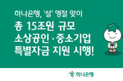 하나은행(은행장 이호성)은 ‘설’을 맞이하여 명절 전후 자금 수요가 많은 소상공인․중소기업에게 오는 3월 13일까지 총 15조원 규모의 특별자금 지원을 실시한다고 밝혔다. 지원대상은 일반대출(운전/시설), 상업어음할인, 무역어음대출 등 1년 이내의 기업대출 신규 및 기 취급 명절(설,추석) 특별자금 대출의 연장(대환)건으로, 최대 1.5% 범위 내 대출금리 감면을 지원한다. 이번 지원 한도는 신규 6조원, 연장 9조원을 더한 총 15조원 규모로, 신규 및 기존대출의 이자를 대폭 절감하여 명절 전후 자금 수요가 필요한 중소기업(개인사업자포함)에게 큰 도움이 될 것으로 기대된다. 또한, 하나은행은 설을 맞이하여 신권교환 수요가 있는 귀성객들을 위해 ‘직접 찾아가는 금융서비스’를 제공한다. 2월 13일(금)과 14일(토) 양일간 오전 10시부터 오후 5시까지 양재 만남의광장 휴게소(하행선)에서 ‘움직이는 하나은행’을 통해 신권교환 행사를 실시한다. 하나은행 관계자는 “설 명절을 맞이하여, 자금이 꼭 필요한 소상공인․중소기업들에게 조금이나마 도움이 되길 기대한다”며 ”가족과 함께 따뜻하고 풍성한 명절 보내시길 바란다“고 말했다. 한편, 하나은행은 지역신용보증재단과