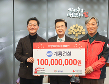 계룡건설 이승찬 회장은 1월 12일 오후 2시, 충남도청을 방문해 김태흠 충청남도 도지사와 성우종 충남사회복지공동모금회장 등이 참석한 가운데 ‘희망 2026 나눔캠페인’ 성금 1억 원을 기탁했다. ‘희망 2026 나눔캠페인’은 연말연시를 맞아 더불어 사는 따뜻한 사회분위기를 조성하고, 시민들의 온정과 사랑을 어려운 이웃들에게 전달해 삶의 희망과 용기를 전하기 위한 성금 모금운동이다. 계룡건설은 매년 이 캠페인에 꾸준히 동참하며 나눔 문화 확산에 앞장서고 있다. 계룡건설 이승찬 회장은 “작은 정성이지만 어려운 시간을 보내고 있는 이웃들에게 위로와 희망이 되기를 바란다”며 “앞으로도 지역사회와 함께하는 다양한 나눔 활동을 지속해 나가겠다”고 말했다. 앞서 계룡건설은 지난 12월 대전시청 남문광장에서 열린 ‘희망 2026 나눔캠페인’ 출범식에 참석해 성금 2억 원을 기탁한 바 있다. 한편, 계룡건설은 매년 나눔캠페인을 통해 대전‧충남‧세종에 이웃돕기 성금을 기탁하고 있으며, 재난‧재해 구호 지원, 장학금 지원, 예비역 주거환경 개선, 장애인체육인 직접고용 등 다양한 분야에서 사회공헌 활동을 꾸준히 전개하며 사회 곳곳에 온기를 전하고 있다.