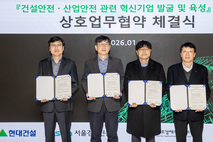 현대건설이 건설 현장 안전문화 확산을 위해 국토교통부, 서울시 산하 공공기관들과 전략적 협업에 나선다. 현대건설은 서울경제진흥원, 서울창조경제혁신센터, 한국건설기술연구원 등 3개 창업지원기관과 건설 안전 혁신기업 공동 발굴 및 오픈이노베이션 프로그램 운영 협력 지원을 위한 업무협약(MOU)을 체결했다고 14일 밝혔다. 지난 13일 서울 종로구 현대건설 본사에서 진행된 협약식에는 임병천 현대건설 안전기획실장, 김종우 서울경제진흥원 창업본부장, 김영준 서울창조경제혁신센터 혁신사업실장, 한재구 한국건설기술연구원 스마트건설지원센터장 등 각 기관 관계자 20여 명이 참석했다. 이번 협약은 정부와 지자체, 민간 건설사가 협력해 건설 현장 내 안전사고를 예방하고, AI CCTV, 건설 로봇, 안전교육 플랫폼 등 안전 관련 혁신 기술/서비스를 선제적으로 도입, 검증된 혁신 기술들을 건설 현장에 확산하기 위한 목적으로 마련됐다. 현대건설은 3개 창업지원기관과 공동으로 ▲건설 안전 혁신기업 발굴 및 육성 ▲오픈이노베이션 프로그램 운영 협력 ▲발굴 기업을 위한 맞춤형 지원 프로그램 협력 지원 등에 적극 나설 예정이다. 또한 3개 기관과 함께 국내 최초로 ‘건설 안전’을 주제로
