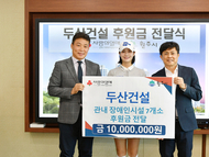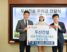 두산건설(대표이사 이정환)은 지난 28일 원주시에 장애인단체 지원을 위한 기부금 1,000만 원을 전달했다고 밝혔다. 기부금 전달식은 원주시청에서 진행됐으며, 김문기 원주부시장과 두산건설 오세욱 상무, 두산건설 We’ve 골프단 소속 박결 프로 등이 참석했다. 이번에 전달된 기부금은 사회복지공동모금회 강원도지회를 통해 원주시 관내 장애인단체 및 장애인시설 7개소의 보수공사 비용으로 사용될 예정이다. 이를 통해 시설 이용 환경을 개선하고, 장애인들이 보다 안전하고 쾌적한 환경에서 생활할 수 있도록 지원할 계획이다. 두산건설은 다양한 분야에서 사회공헌 활동을 꾸준히 전개해 왔으며, 그중에서도 장애인의 자립과 사회활동 참여 확대를 위한 지원을 지속적으로 강화하고 있다. 대표적으로 2023년과 2024년에는 ‘두산건설 We’ve 챔피언십’ 갤러리 티켓 판매대금을 장애인 체육 종목 및 선수 후원에 활용했으며, 매년 다양한 프로그램을 통해 마련된 기부금으로 장애인 관련 사업을 펼치고 있다. 최근에는 프로골퍼 신지애 선수와 매칭그랜트 방식의 공동 기부를 진행하며 사회공헌의 폭을 더욱 넓혔다. 선수 개인의 선한 영향력과 기업의 사회적 책임을 결합한 이번 기부를 비롯해, 두