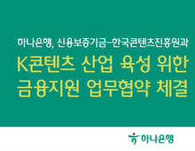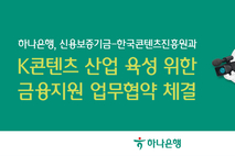 하나은행(은행장 이호성)은 신용보증기금(신보), 한국콘텐츠진흥원(콘진원)과 ‘K-콘텐츠 산업 육성을 위한 금융지원 업무협약’을 체결했다. 이번 협약은 독창적인 아이디어와 창의력을 가진 문화콘텐츠 기업들이 자금 조달의 어려움을 극복할 수 있도록 지원하기 위해 마련됐다. 하나은행은 총 10억 원(특별출연 7억 원, 보증료 지원 3억 원)을 신용보증기금에 출연한다. 이를 통해 지원 대상 기업은 전액 보증으로 대출 실행이 용이해지고, 연 1.0%의 보증료 지원 혜택을 받아 금융 비용 부담이 완화된다. 금융 혜택 대상은 한국콘텐츠진흥원이 추천한 ‘문화산업완성보증’ 및 ‘특화보증’ 대상 기업으로, 콘텐츠 기획과 제작을 하는 문화콘텐츠 기업이다. 서유석 하나은행 기업그룹 부행장은 이번 협약이 K-콘텐츠의 글로벌 경쟁력 확보를 지원하는 데 의미가 있다고 설명했다. 그는 앞으로도 문화콘텐츠 기업들이 아이디어를 사업화하는 데 필요한 자금 조달에 힘쓰겠다고 밝혔다. 한편 하나은행은 소셜벤처기업 지원을 위해 기술보증기금에 5억 원을 특별출연하고, 100억 원 규모의 소셜벤처기업 육성자금을 공급하고 있다.