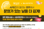 KB국민카드(사장 김재관)는 문화체육관광부 산하기관인 지역문화진흥원(원장 정광렬)과 협력하여 ‘문화가 있는 날’의 국민 참여를 확대하고 지역 문화 소비 활성화에도 나선다. KB국민카드는 오는 20일부터 다음달 2일까지 ‘제 33회 아시아태평양경제협력체(APEC) 정상회의’가 열리는 경주에서 문화시설를 이용하면 문화지원금을 제공하는 '10월 문화가 있는 날은 APEC 개최지 경주에서’ 행사를 실시한다. 행사 기간 동안 경주 지역 내 영화관, 공연장, 전시장 등 300여개 문화시설에서 KB국민카드로 1만원 이상 결제한 고객 중 2천명을 추첨해 1만원 문화지원금(캐시백)을 제공한다. 이번 행사는 매달 마지막 수요일과 그 주간에 한정되어 제공해 온 ‘문화가 있는 날’ 혜택을 경주를 중심으로 확대 운영하여 지역 문화시설 이용을 활성화하고 문화 소비를 촉진하기 위한 취지로 마련되었다. 행사 관련 세부 내용은 KB Pay와 KB국민카드 홈페이지에서 확인 가능하다. KB국민카드 관계자는 "많은 국민들이 APEC 정상회의가 열리는 경주로 찾아와 문화를 즐기며 지역의 매력을 새롭게 발견하시길 기대한다”며, “이번 행사가 지역 문화 소비 확대뿐 아니라 지역 경제 활성화에도 긍정