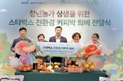 스타벅스 코리아(대표이사 손정현)가 청년농업인의 성장과 소득 증대 지원을 위해 농림수산식품교육문화정보원(원장 윤동진, 이하 농정원)에서 선정한 전국 17개 지역의 우수 청년농가 21곳에 200톤에 이르는 친환경 커피 퇴비 1만 포대를 기부한다. 이를 위해 스타벅스는 지난 12월 16일 퇴비지원 수혜 청년농가 및 농정원, 자원순환사회연대 관계자들을 초청해 서울 역삼동에 위치한 스타벅스 코리아 지원센터에서 커피 퇴비 지원식을 가졌다. 이번에 커피 퇴비가 전달되는 청년농가는 경기도(평택), 강원도(태백), 충청북도(괴산, 충주), 충청남도(예산, 당진), 전라남도(강진, 나주, 고흥), 경상북도(경산, 김천, 상주, 영주), 경상남도(김해, 하동, 거창), 부산 등 전국 각지에 분포되어 있으며, 쌀, 콩, 참깨, 배추, 사과, 배, 복숭아, 토마토, 복숭아, 딸기, 유자, 블루베리, 포도, 자두 등 다양한 지역 특산물을 재배하고 있다. 이날 기념식에서 사과를 재배하는 경남 거창 지역 청년농업인 민천홍씨는 “스타벅스 커피 퇴비 지원은 토양 회복과 고품질 사과 생산에 큰 힘이 되는 뜻깊은 지원”이라며, “더 건강하고 맛있는 사과로 보답할 것” 이라고 소감을 밝혔다.
