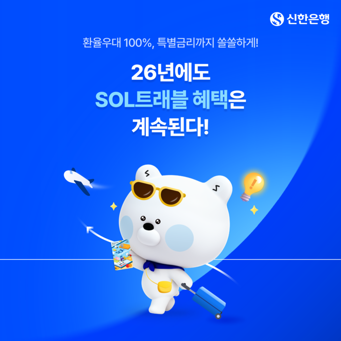 신한은행(은행장 정상혁)은 ‘신한 SOL트래블 체크카드’의 누적 환전액이 20억 달러를 돌파한 것을 기념해 환율우대 100% 혜택과 외화예금 특별금리 이벤트를 2026년 연말까지 연장한다고 18일 밝혔다.
