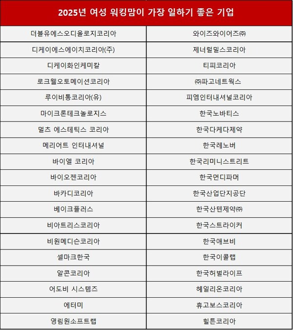 2025년 대한민국 여성 워킹맘이 일하기 좋은 기업에 선정된 기업들은 여성 워킹맘이 일하기 좋은 조직문화와 제도를 조성해 왔으며, 이를 통해 기업의 생산성과 직원의 만족도를 높이는 데 성공했다. 이번 '2025년 대한민국 여성 워킹맘이 일하기 좋은 기업'에 선정된 기업들은 아래와 같다.