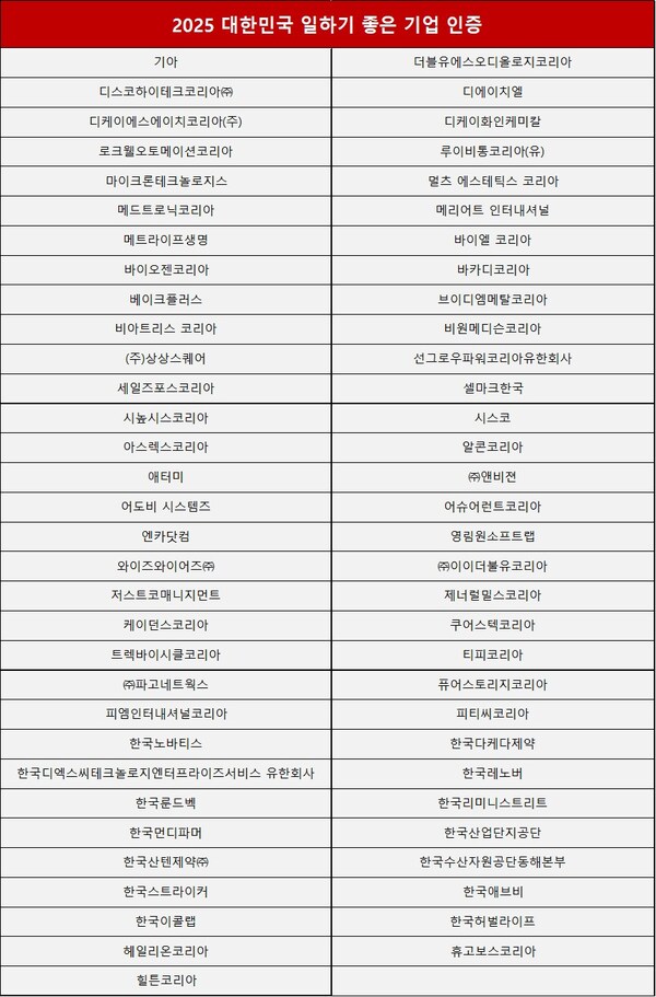 글로벌 신뢰경영 평가 기관인 Great Place To Work® Institute와 GPTW코리아(대표 지방근)가 주최한 '2025 Certification Nation Day - 한국에서 가장 일하기 좋은 기업'이 발표됐다.