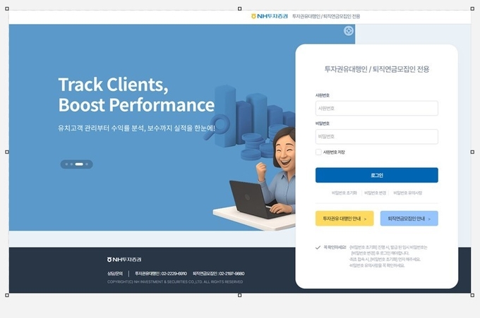 NH투자증권(대표이사 윤병운)은 투자권유대행인과 퇴직연금모집인의 영업 및 관리 업무 효율화를 위해 전용 홈페이지를 구축하고 1차 서비스를 오픈한다고 15일 밝혔다.