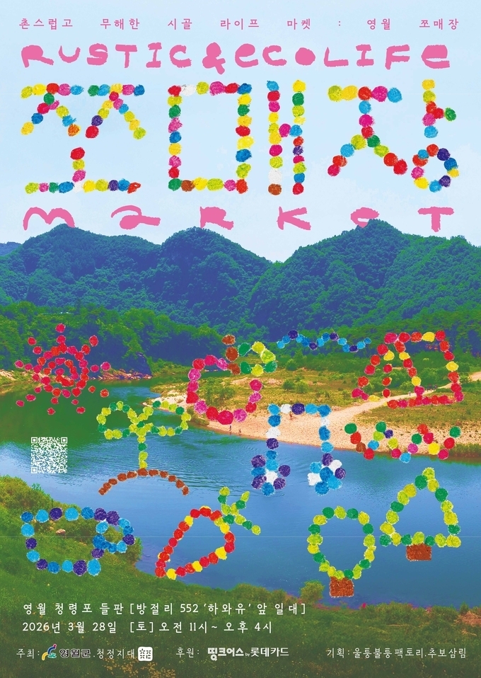 ‘영월 쪼매장’은 3월 28일 오전 11시부터 오후 4시까지 영월군 청령포 들판(방절리 522 일원)에서 열린다. 전국 31개 청년 창업 기업이 참여해 지역 자원을 활용한 식품과 예술/공예품 등을 선보인다. 최근 흥행한 영화 ‘왕과 사는 남자’의 배경지인 청령포의 자연 경관도 함께 즐길 수 있다.