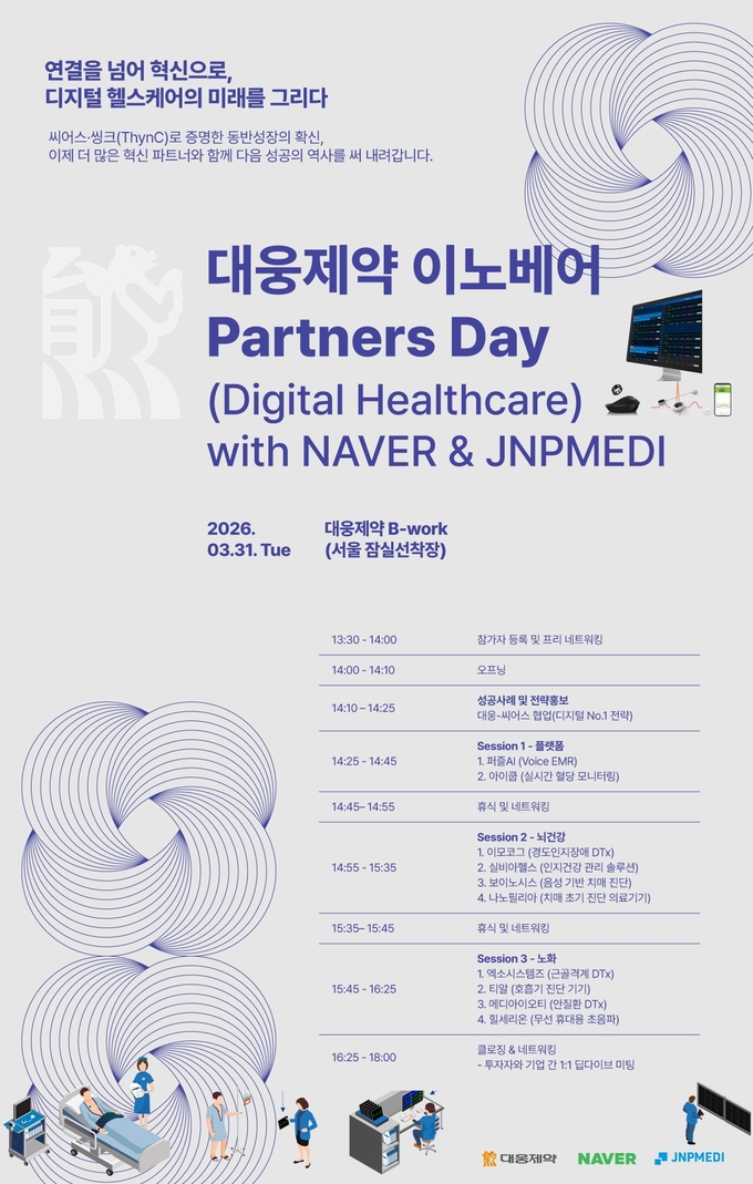 대웅제약은 오는 3월 31일 서울 잠실 선착장 ‘비워크(B-work)’에서 ‘대웅제약 이노베어 Partners Day (Digital Healthcare) with NAVER & JNPMEDI’를 개최한다고 밝혔다. 이번 행사는 대웅제약이 주최하고 네이버, 제이앤피메디(JNPMEDI)가 공동 참여해, 3사가 함께 발굴·육성해 온 디지털 헬스케어 포트폴리오 기업들의 성과를 외부 시장에 공개하는 자리다.