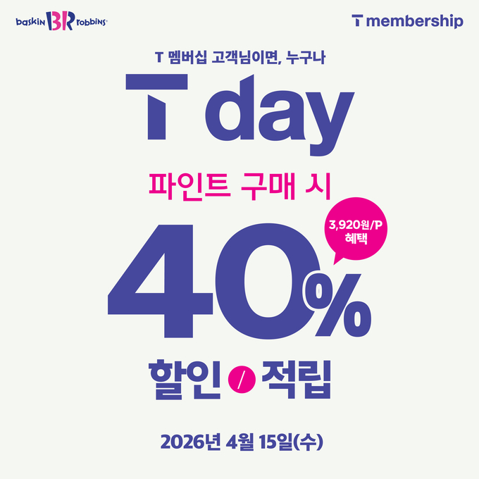 15일 하루동안 전국 배스킨라빈스 매장에서 파인트(9,800원) 사이즈 구매 시 40% 할인 또는 T플러스 포인트 적립 혜택이 제공된다.