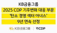 KB금융그룹(회장 양종희)이 10일, 탄소정보공개 프로젝트(Carbon Disclosure Project, 이하 CDP) 한국위원회에서 국내 산업별 '기후변화 대응 부문 우수 기업'에게 수여하는 '탄소경영 섹터 아너스'에 9년 연속 선정됐다. 영국에 본부를 둔 CDP는 전 세계 주요 상장기업을 대상으로 기후변화 대응 등과 관련한 경영정보를 요청하는 글로벌 프로젝트이자 국제적인 비영리 기관으로, CDP의 평가 결과는 글로벌 환경 분야에서 신뢰도 높은 지표로 인정받고 있다. 2025년에는 2만 3천여개 기업이 CDP를 통해 환경정보를 공개하였으며, 수집된 정보는 매년 보고서로 발표되어 전 세계 금융기관의 투자지침서로 활용되고 있다. KB금융은 지난해 12월, '2025 CDP 기후변화 대응 부문(Climate Change)' 평가에서도 최상위 등급인 '리더십(Leadership) A'를 2년 연속 획득하며, 기후변화 대응을 위한 지배구조 체계, 경영전략 수립, 탄소감축목표·성과 등에서 높은 평가를 받은 바 있다. 또한 2050년 탄소중립 이행을 위한 중장기 추진 전략인 'KB Net Zero S.T.A.R.'를 기반으로 ▲녹색금융 투자 확대 ▲자산 포트폴리오 관