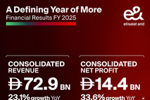 이앤드(e&)가 2025년 사상 최대 실적을 달성하며 전년 대비 23.1% 증가한 수치인 연결 매출 729억 디르함을 기록했다고 발표했다. 연결 순이익은 144억 디르함으로 33.6% 증가했으며, 이는 전 사업 부문에서의 성과 개선에 힘입은 것이다. 연결 EBITDA는 전년 대비 21.1% 증가한 320억 디르함을 기록했다. 이앤드 UAE는 견조한 성장세를 이어가며 가입자 수가 1630만 명을 넘어 전년 대비 8.4% 증가했다. 그룹 전체 가입자 수는 2억 4470만 명으로 확대돼 2024년 대비 31.3% 증가했다. 2025 회계연도 주요 재무 지표 2025년 2024년 증감률 매출 729억 디르함 592억 디르함 23.1 % 순이익 144억 디르함 108억 디르함 33.6 % EBITDA 320억 디르함 2